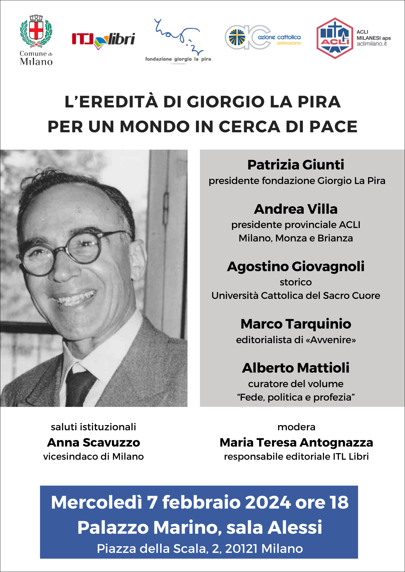 L’evento si svolgerà a Milano mercoledì 7 febbraio 2024 presso Palazzo Marino, piazza della Scala 2, nella sala Alessi. L’inizio è previsto per le ore 18 e sarà scandito da interventi di testimoni autorevoli: Patrizia Giunti, presidente della Fondazione Giorgio La Pira; Andrea Villa, presidente provinciale ACLI di Milano; Monza e Brianza; Agostino Giovagnoli, storico; Marco Tarquinio, editorialista di «Avvenire» e Alberto Mattioli, curatore del volume edito da In Dialogo.