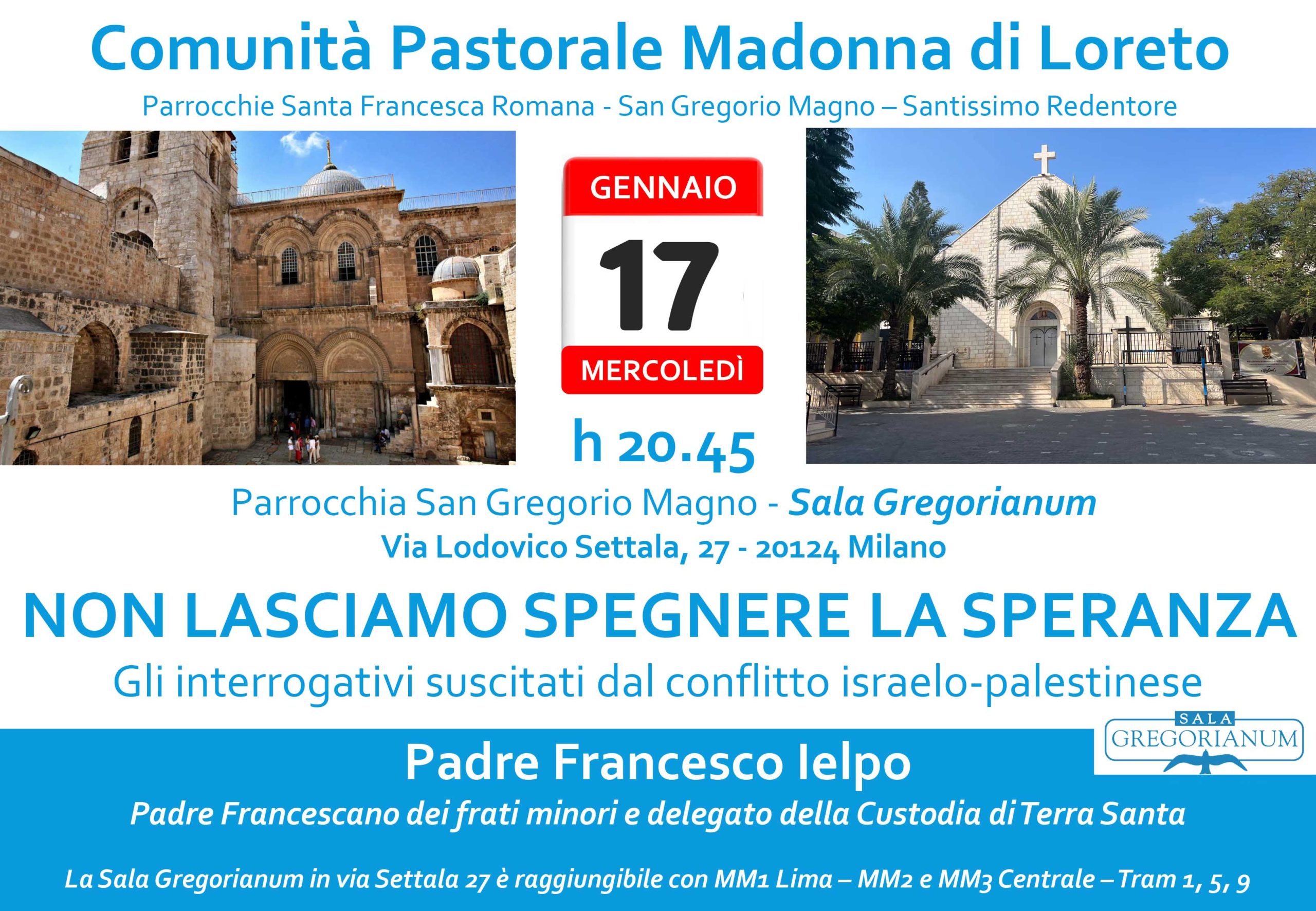 L’appuntamento è per mercoledì 17 gennaio alle ore 20.45 presso la Parrocchia Gregorio Magno (Sala Gregorianum, via Ludovico Settala, 27 – Milano). Interviene padre Francesco Ielpo, padre francescano dei frati minori e delegato della Custodia di Terra Santa.