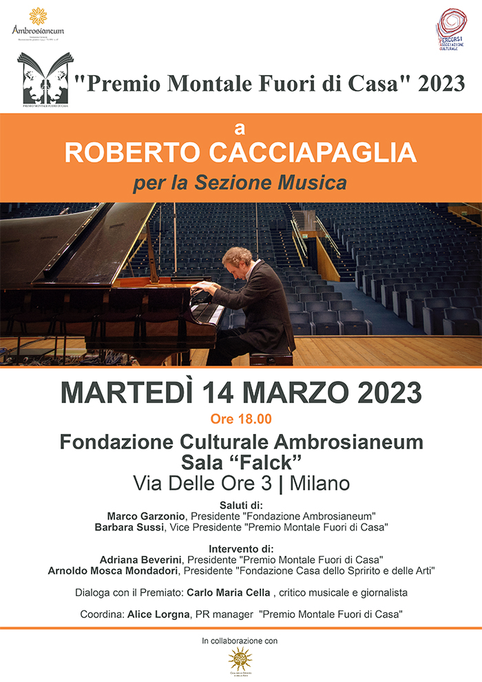 Fondazione Ambrosianeum, in collaborazione con la Fondazione Casa dello Spirito e delle Arti, il 14 marzo alle 18.00 in Sala Falck (Via delle Ore 3), ospiterà il PREMIO MONTALE FUORI DI CASA 2023 sezione Musica, in occasione della Premiazione al Maestro Roberto Cacciapaglia.