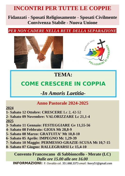 Presso il Convento Francescano di Sabbioncello (LC) una iniziativa rivolta a tutte le coppie: fidanzati, sposati religiosamente, sposati civilmente, persone in convivenza stabile e in nuova unione sul tema Come crescere in coppia, per non cadere nella rete della separazione.