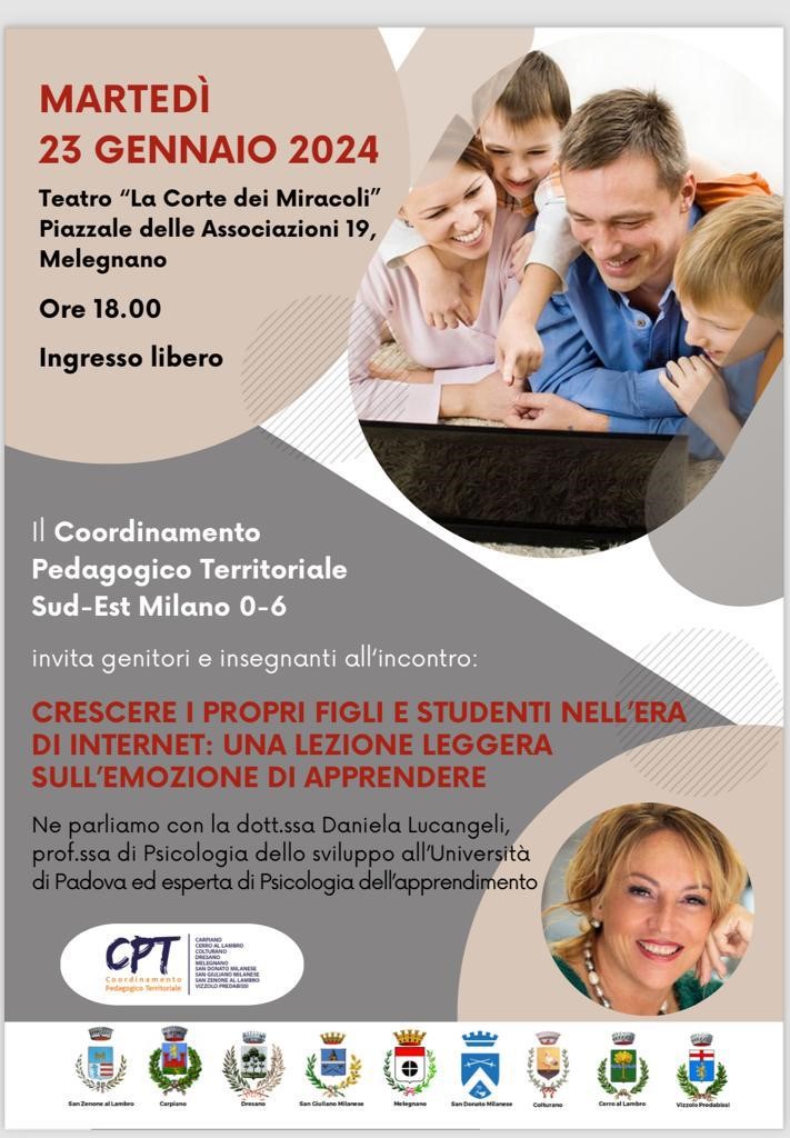 L’incontro Crescere i propri figli e studenti nell’era di internet: una lezione leggera sull’emozione di apprendere si svolegarà martedì 23 gennaio alle ore 18 a Melegnano, presso il Teatro la Corte dei Miracoli (piazzale delle Associazioni 19).