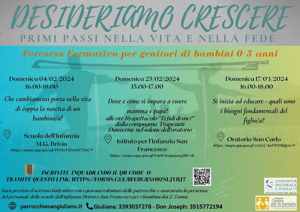 Gli incontri del percorso Desideriamo crescere. Primi passi nella vita e nella fede si terranno la domenica: il 4 febbraio dalle 16 alle 18 presso la Scuola dell’Infanzia M.G.Brivio; il 25 febbraio dalle 15 alle 17 ppresso l’Istituto per l’Infanzia San Francesco; il 17 marzo dalle 16 alle 18 presso l’Oratorio San Carlo di San Giuliano Milanese.