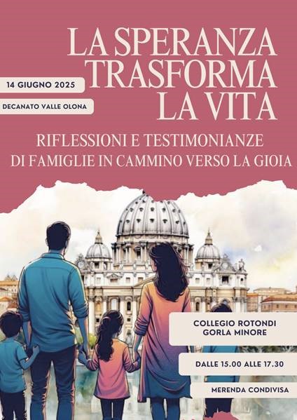 Venerdì 14 giugno, a partire dalle ore 15, il Collegio Rotondi di Gorla Minore ospiterà un incontro promosso dal Decanato Valle Olona dal titolo “La speranza trasforma la vita”. Sarà un momento di riflessione comunitaria e ascolto, durante il quale alcune famiglie offriranno la loro testimonianza di cammino verso la gioia, condividendo esperienze di fede, resilienza e rinnovata speranza.