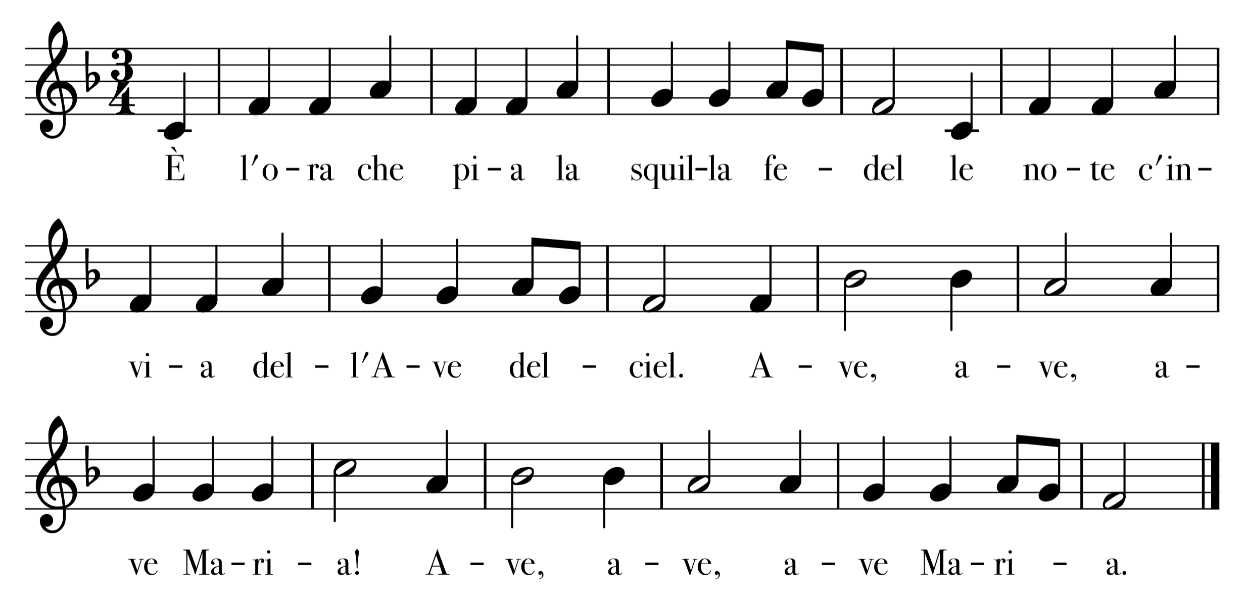 Canto simbolo della Madonna di Lourdes, conosciuto anche con il titolo “è l’ora che pia”, è un canto adatto per le celebrazioni mariane o come canto conclusivo.