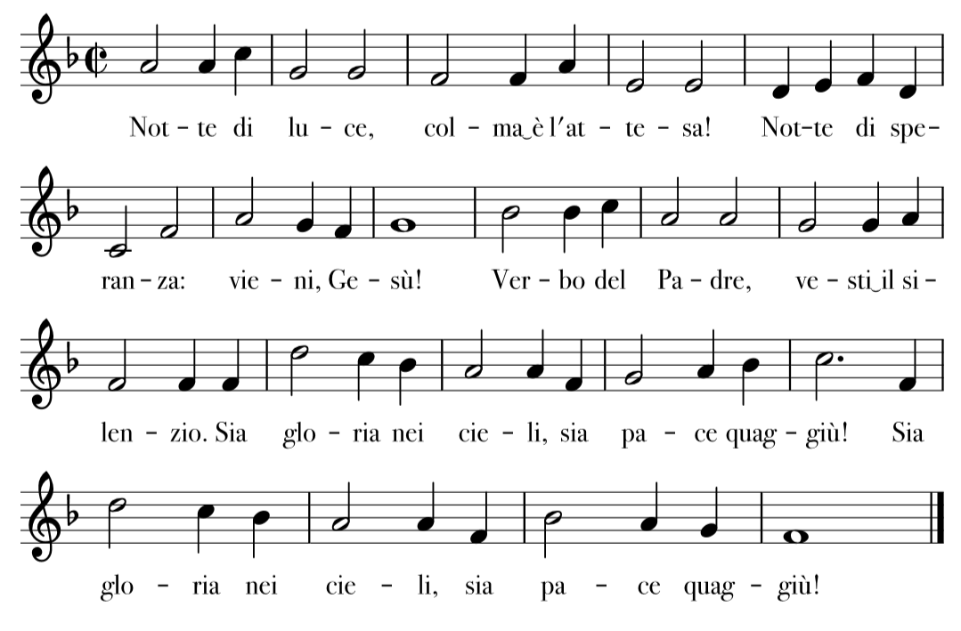 Canto del periodo di Natale il cui testo è particolarmente adatto per la Messa della Notte di Natale o per la Veglia. Vengono di seguito riportati i testi riferiti all’Avvento, scritti da don Giancarlo Boretti; essendo parafrasi dei testi delle Antifone previste Dopo il Vangelo, sono particolarmente indicate per questo momento ma possono essere usati liberamente in altri contesti.