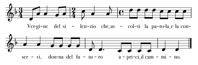 Vergine del silenzio . Spartiti Elaborazione Lieggi Audio Esecuzione a cura degli animatori liturgici della parrocchia Santi Pietro e Paolo di Lissone https://www.chiesadimilano.it/servizioperlapastoraleliturgica/files/2020/10/Vergine-del-Silenzio-Lissone.mp3 Pubblicato mercoledì 14 Ottobre 2020 Modificato il mercoledì 14 Ottobre 2020