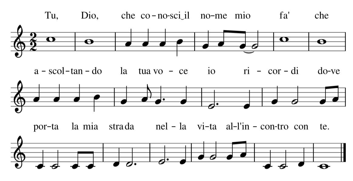 Il canto (testo e musica di Pierangelo Sequeri) parla della chiamata di Dio per ciascuno di noi:  Dio ci chiama per nome ma è necessario cambiare identità, personalità che vuol dire un nuovo stile di vita, un modo nuovo di vedere il rapporto con i nostri fratelli.