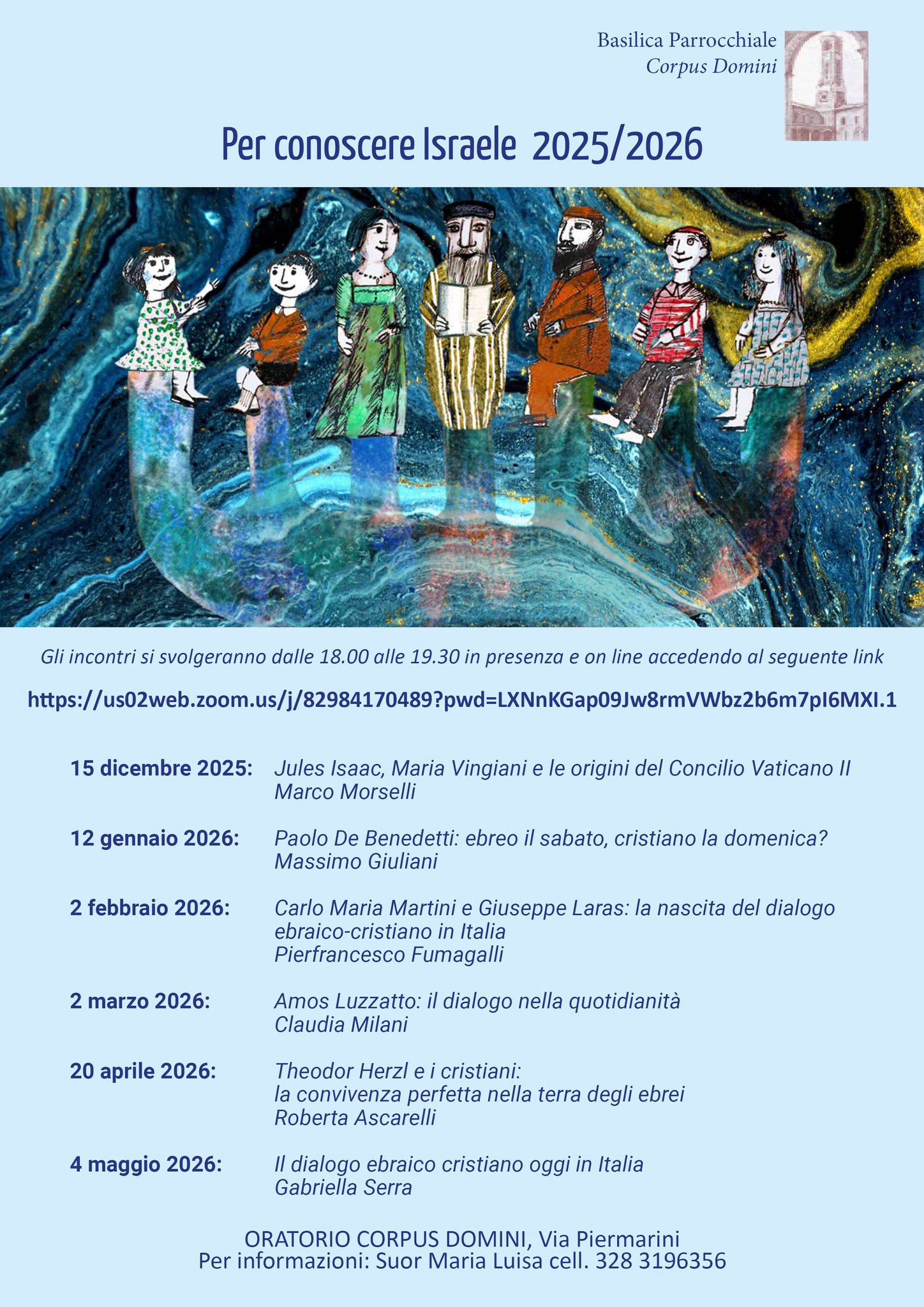 La parrocchia Corpus Domini di Milano propone un ciclo di incontri “Per conoscere Israele” che si terranno di lunedì a partire dalle ore 18, in presenza ma con possibilità di collegamento da remoto, con un focus sulla storia e l’attualità del dialogo ebraico-cristiano in diocesi e in Italia.