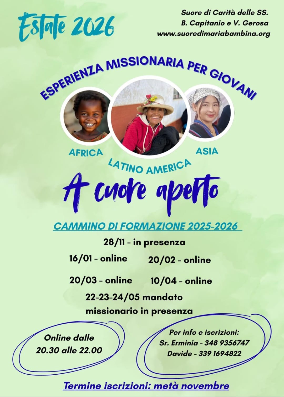 L’opportunità di affiancare le Suore di Maria Bambina in Africa, America Latina o Asia è aperta a tutti i giovani desiderosi di mettersi in gioco. È fondamentale, tuttavia, affrettarsi: il termine ultimo per iscriversi al Cammino di Formazione è fissato per metà novembre. Per maggiori informazioni e per formalizzare l’adesione, è possibile contattare i referenti che trovate sul volantino da scaricare qui di seguito.