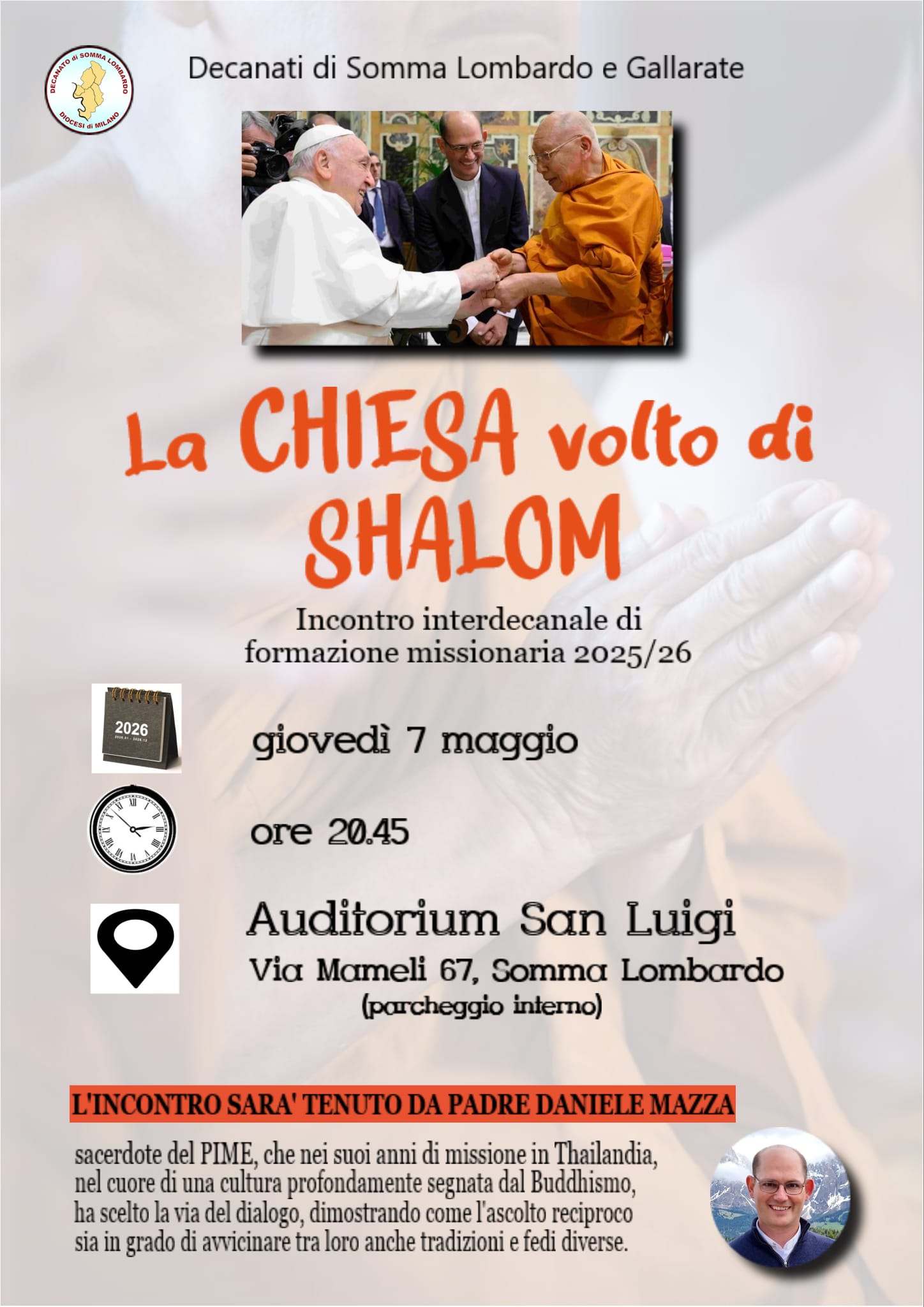 Il percorso di formazione missionaria promosso dai Decanati di Somma Lombardo e Gallarate giunge a un appuntamento centrale per l’anno 2025/26, ponendo l’accento sulla capacità della Chiesa di farsi costruttrice di pace in contesti multiculturali. L’incontro, intitolato significativamente “La CHIESA volto di SHALOM”, si terrà giovedì 7 maggio 2026 alle ore 20.45 presso l’Auditorium San Luigi di via Mameli 67 a Somma Lombardo.
