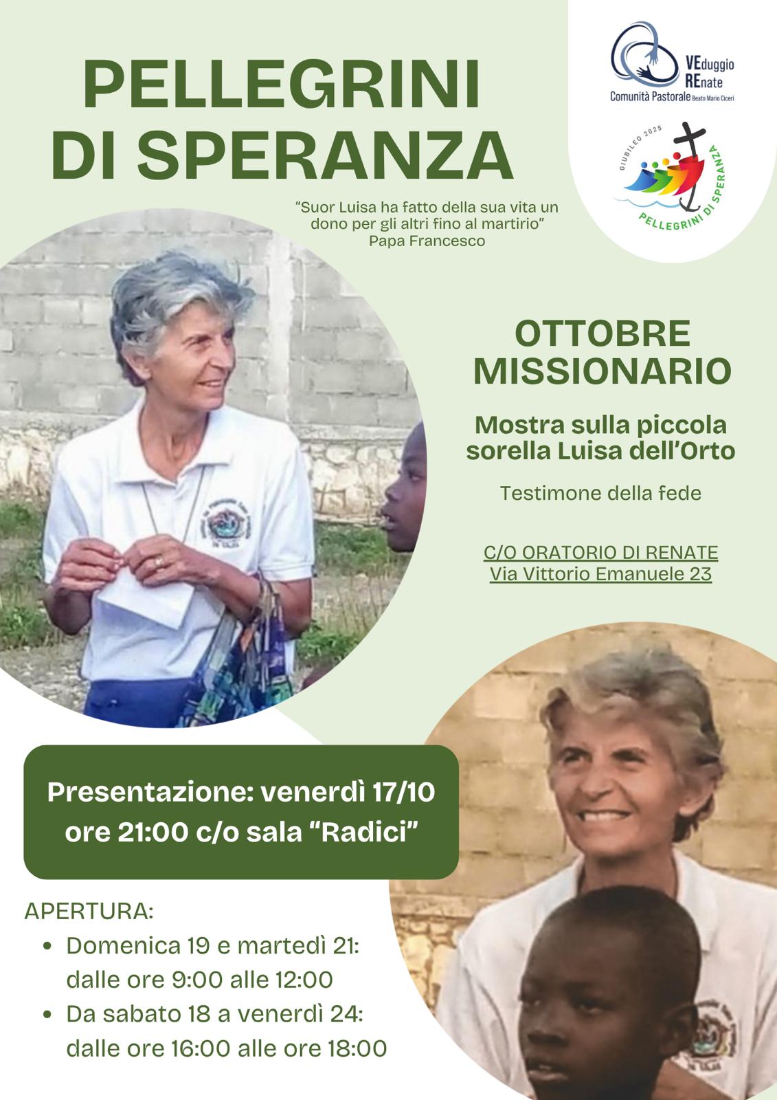 La Comunità Pastorale Beata Maria Gaetana, che unisce Veduggio con Colzano e Renate, invita a vivere l'Ottobre Missionario con uno sguardo rivolto alla straordinaria figura di Suor Luisa dell'Orto