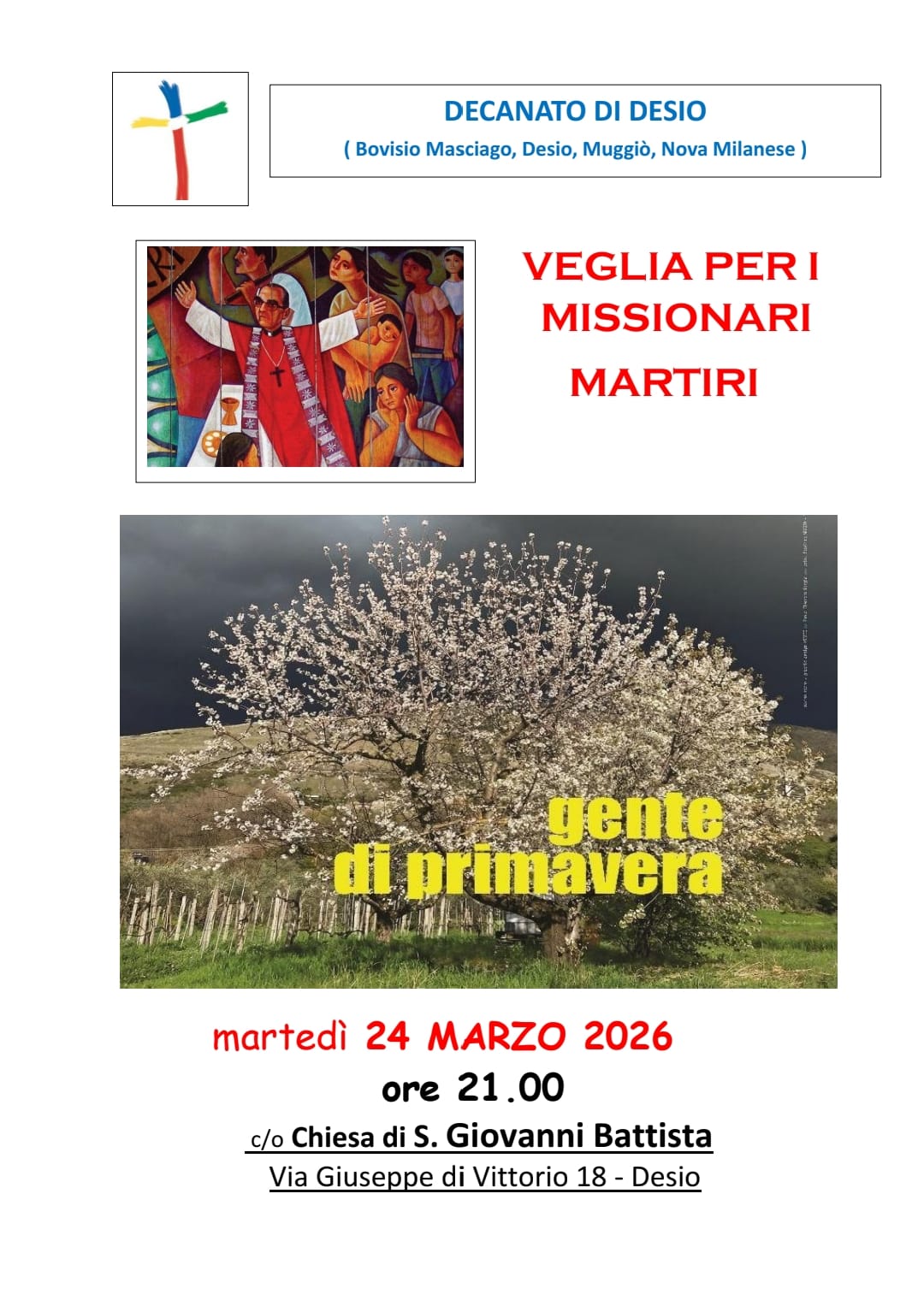 Il Decanato di Desio, che unisce le comunità di Bovisio Masciago, Desio, Muggiò e Nova Milanese, annuncia la Veglia per i Missionari Martiri, il cui titolo quest’anno, è:”Gente di Primavera”.