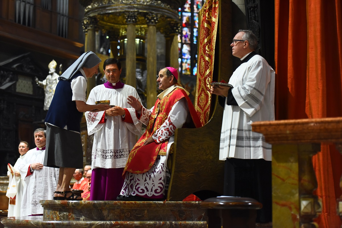 Il Santo Chiodo, la reliquia più preziosa della nostra Chiesa, simbolo della Passione attraverso il chiodo della croce di Cristo, attestata dal 1263 nella Basilica di Santa Tecla e, in Duomo, dal 1461; reliquia particolarmente cara a san Carlo, come ai suoi successori moderni, è ancora per qualche momento sull’altare maggiore del Duomo, quando monsignor Delpini – che presiede l’Eucaristia tra i Vespri, concelebrata dai Canonici del Capitolo metropolitano e da altri sacerdoti, tra cui il vicario episcopale per la Zona I-Milano – ne definisce il significato.