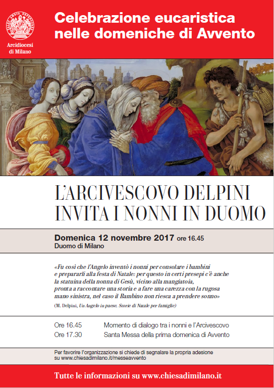 Nella dimensione familiare con cui monsignor Delpini ha voluto caratterizzare il tempo che precede e prepara al Natale, in ciascuna delle sei domeniche rivolge il suo invito a partecipare alla celebrazione in Duomo a una categoria particolare di persone che aiutano altre persone, che hanno responsabilità educative nella società, accanto sia ai ragazzi e ai bambini, sia agli anziani, oppure sono vicini alla sofferenza. Per domenica 12 novembre l’invito è indirizzato ai nonni. Come anche per le successive celebrazioni, l’Arcivescovo si rivolge a loro per sostenerli con il suo magistero a vivere l’Avvento, nella consapevolezza che a loro volta possano trasmettere il messaggio nelle loro relazioni di cura.