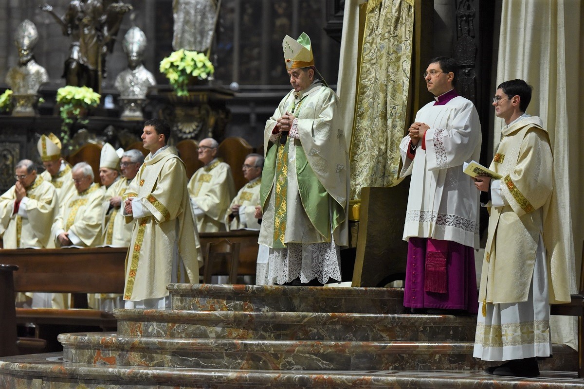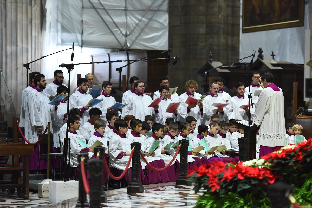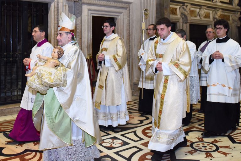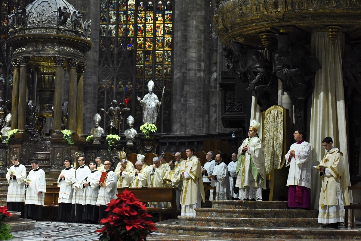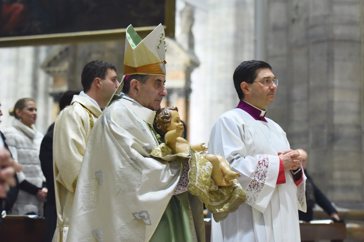 Un inno capace di divenire «cantico che può riscattare gli insulti e la rinuncia alla libertà e il suo disprezzo», dice ancora il Vescovo che, all’inizio della Messa – concelebrata da alcuni membri del Consiglio Episcopale Milanese, tra cui il vicario generale, monsignor Franco Agnesi e il vicario episcopale di Zona I-Milano, monsignor Carlo Azzimonti, unitamente al canonici del Capitolo metropolitano della Cattedrale con l’Arciprete, monsignor Gianantonio Borgonovo -, porta in processione e depone, ai piedi all’altre maggiore, la statua del Bambino