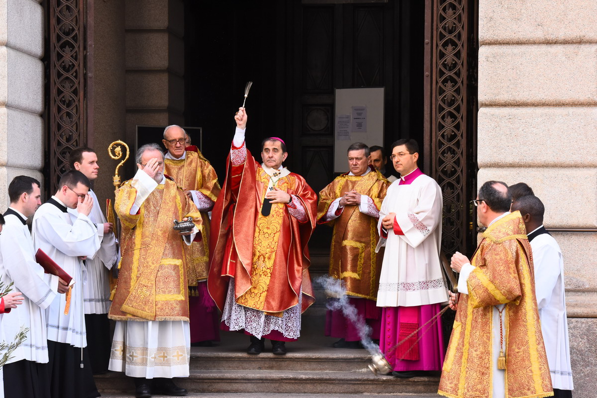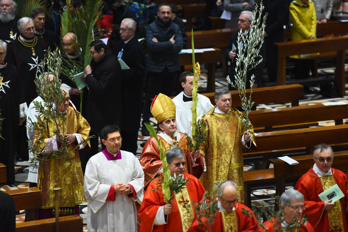 È la domenica delle Palme e, dopo la benedizione delle Palme e degli Ulivi presso la chiesa di Santa Maria Annunciata in Camposanto, la processione dei Canonici del Capitolo della Cattedrale, dei membri dell’Arciconfraternita del SS. Sacramento, degli Ordini Cavallereschi e di tanta gente porta i fedeli in Duomo per il Pontificale solenne presieduto dall’Arcivescovo. Molte le famiglie, i giovani e i bambini per la presenza di tutte le componenti della scuola paritaria “La Zolla”.