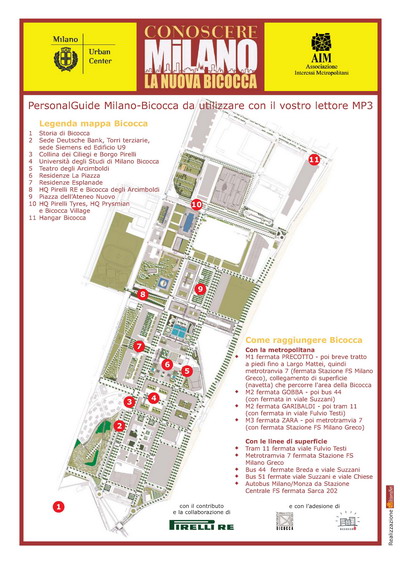 L’iniziativa nata diversi anni fa («Conoscere Milano. La città che cambia»), con la duplice conduzione di Urban Center e Aim (Associazione interessi metropolitani), riparte con un servizio in più che riguarda la messa in rete delle PersonalGuide, la prima delle quali è dedicata a “La Nuova Bicocca”, il primo grande intervento di riqualificazione di un’area industriale dismessa della città. L’audioguida è stata realizzata con la collaborazione e il sostegno di Pirelli Re.
